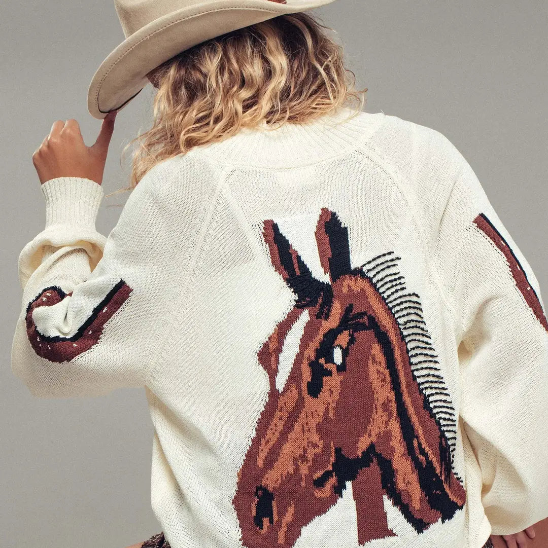 Cozy button-front cardigan in warm cream knit, featuring bold horse intarsia artwork on the back and playful horseshoe motifs along the sleeves. Designed with a relaxed, slightly oversized fit, dropped shoulders, patch pockets, and contrast buttons for a rustic-meets-modern vibe. 100% Polyester