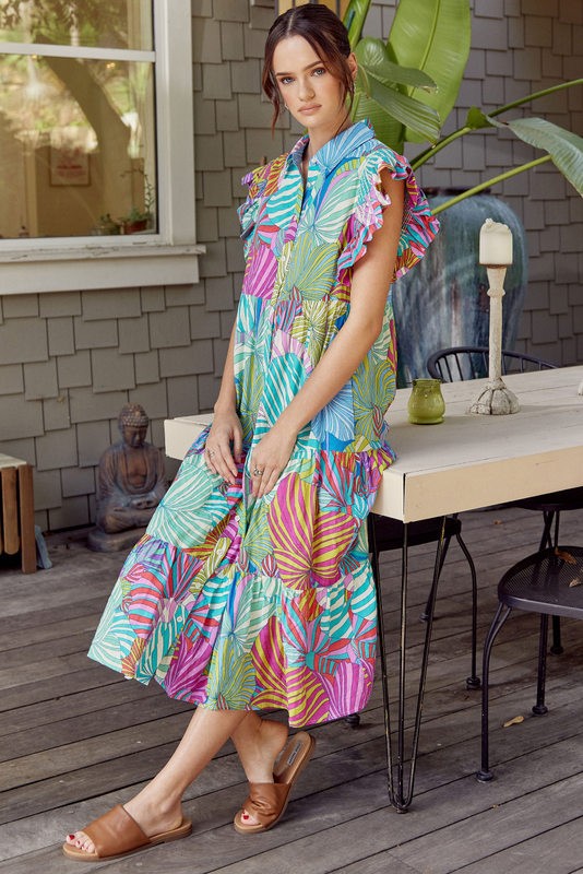 Multicolor print midi dress with collared neck, smocked frill shoulder, side pockets, and tiered layer. - Button-front, non-sheer, lightweight. - Model is 5'8'' and is wearing a Small.