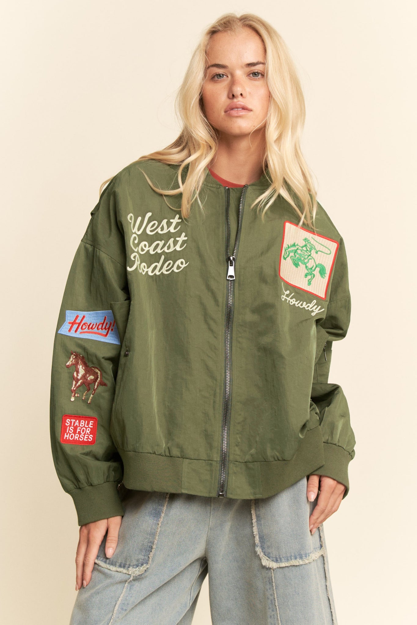 Western-inspired bomber jacket with bold cowboy embroidery and "West Coast Rodeo" lettering. Lightweight nylon shell with ribbed cuffs and hem, zip front, side pockets, and sleeve pocket. Available in Olive Green and Black. Perfect statement piece for boutiques, festival fashion, and streetwear collections. Details: Construction: 100% Nylon shell Fit: Oversized bomber fit