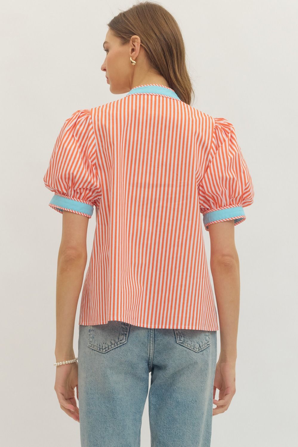Stripe print short puff sleeve top featuring V-neckline with contrast binding. Button closure at front. Unlined. Woven. Non-sheer. Lightweight.