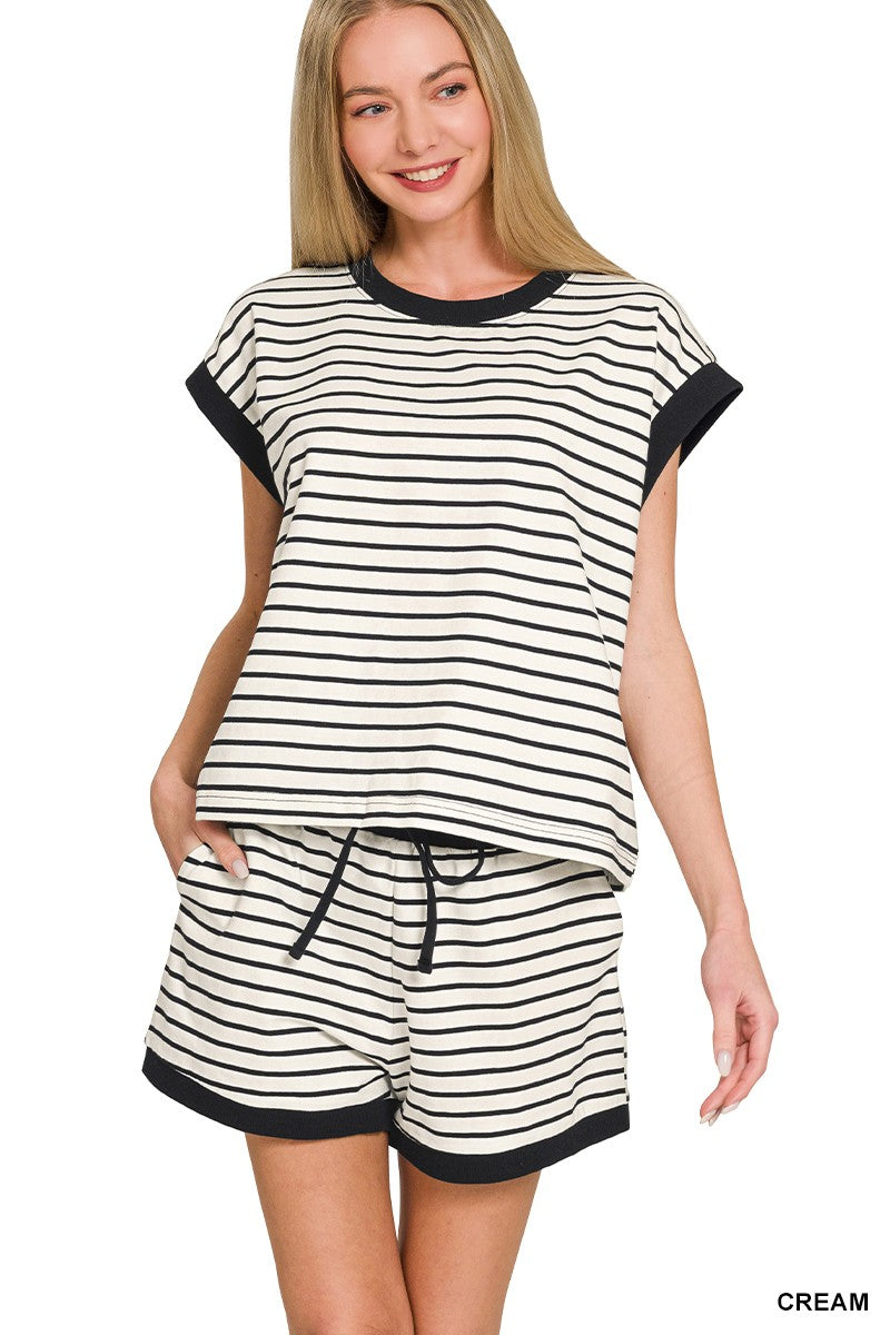 STRIPE CONTRAST TRIM RIB BANDED TOP & SHORTS SET ** TOP TOTAL BODY LENGTH: 22", BUST: 44.5" approx. - MEASURED FROM SMALL ** SHORTS TOTAL WAIST: 27.5", INSEAM: 2.75" approx. - MEASURED FROM SMALL