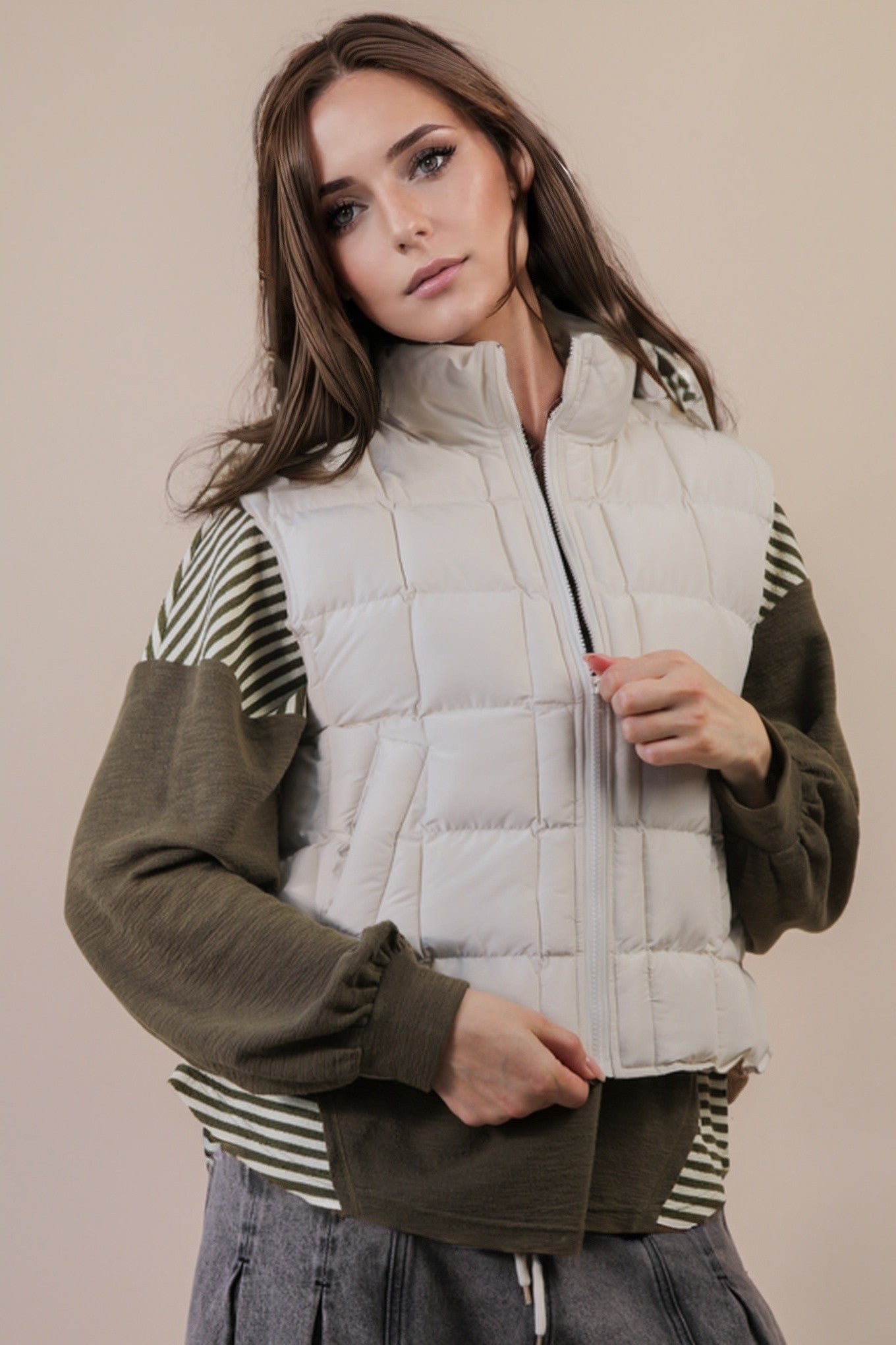 - Solid Color Puffer Padded Warm Vest - High Neck - Zip Up - Side Pockets - Side Slit