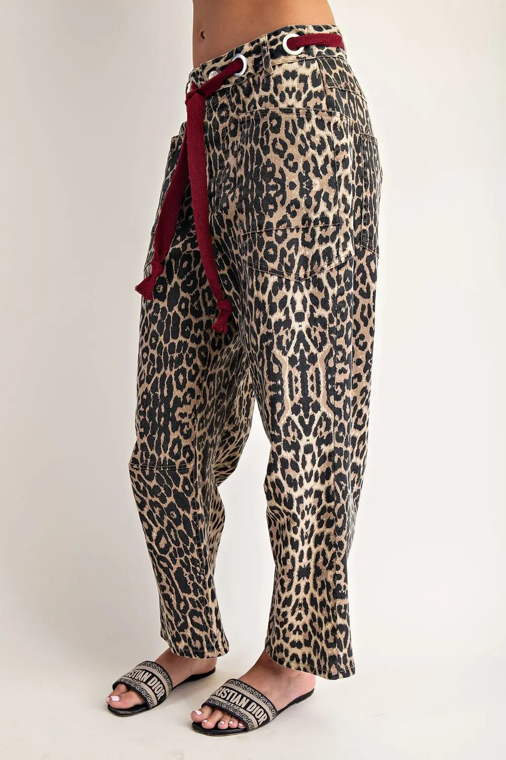 Product Detail: These enzyme and mineral washed leopard print pants showcase a barrel leg silhouette, oversized patch pockets, grommet accented belt loops with a chunky contrast drawstring tie, and subtle seam detailing at the knees for a statement making and laid back streetwear edge.
