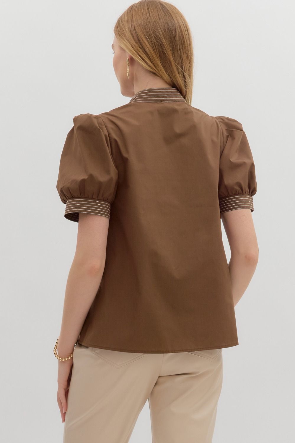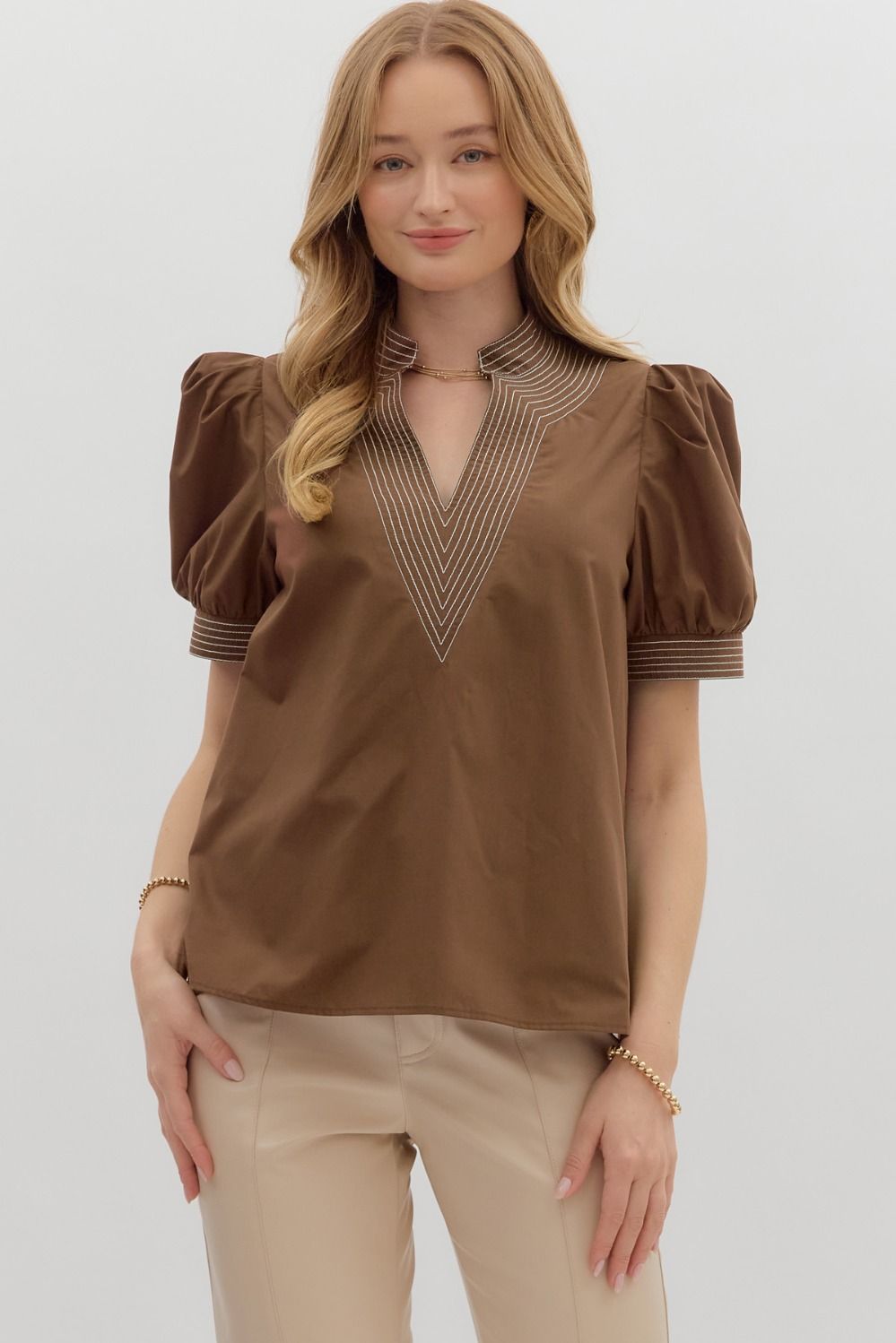 Solid short puff sleeve V-neck top featuring contrast accent stitch detailing. Unlined. Woven. Non-sheer. Lightweight.