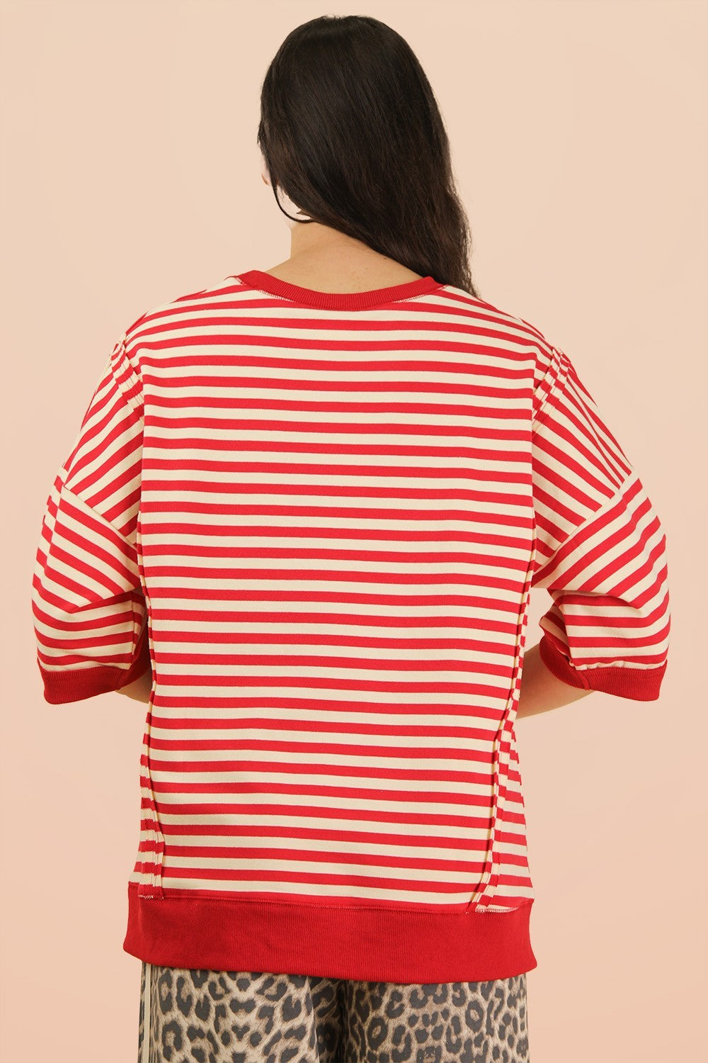 - Oversized Stripe Casual Knit Top - Round Neck - Drop Shoulder - Short Sleeve - Front Slit - Valentine's Day Outfit (Model height: 5"9", wearing a Small, 2-2-2 Size Ratio, NEW IN)