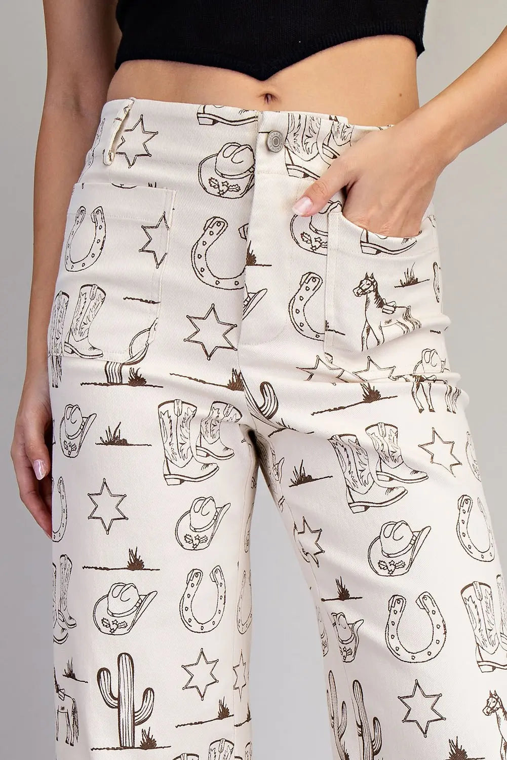 These cream toned pants feature an allover Western inspired sketch print with boots, horseshoes, cacti, and cowboy hats, designed with front and back patch pockets, belt loops, and a button and zipper closure, finished with a cropped straight leg silhouette for a playful yet polished statement look.