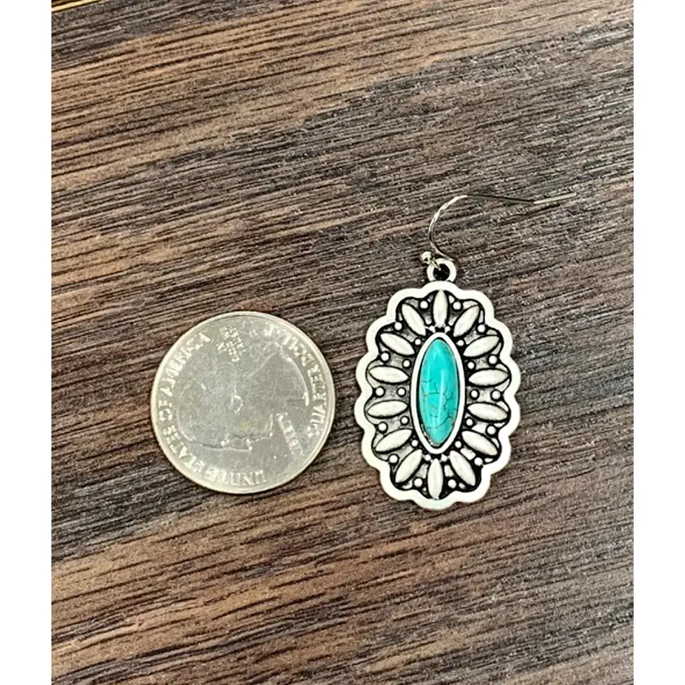 1.2" Long, Concho Turquoise Earrings * Natural stones may vary in size, color or shape * 1.2" long earrings & fish hook * Each earring 7 grams weight * Alloy metal, antique silver plate * Nickel, Lead & Chrome free