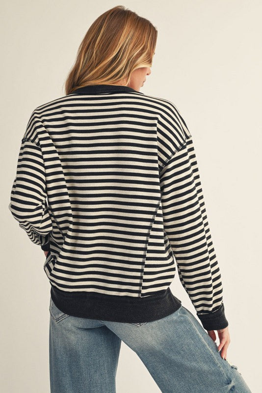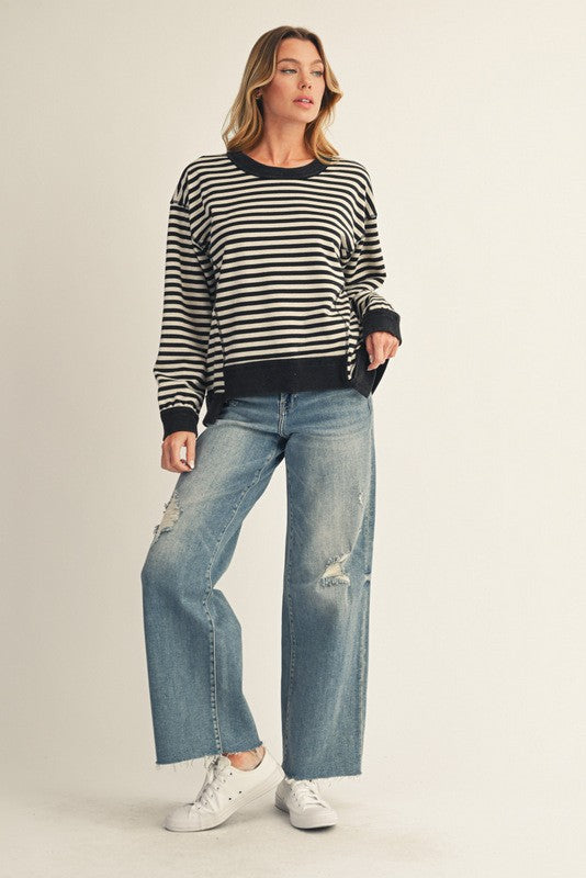 Drop shoulder stripe top with solid contrast, stitch detail, unbalanced hem. - Model is 5'8'' and is wearing a Small.