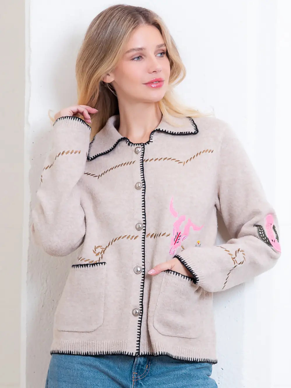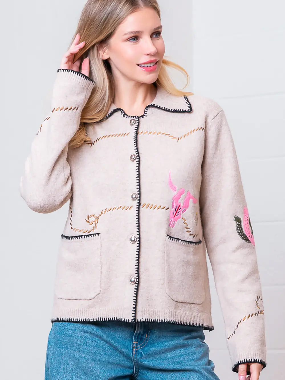 DESCRIPTION -Style: Western embroidery long sleeve sweater jacket -Texture: soft -Color: Oatmeal -Pattern Type: Western print -Details: long sleeve, collared, 2 front pockets, embroidery -Neckline: collared -Sleeve Length: long sleeve -Fit Type: relaxed fit SIZE &FIT The model is wearing size S Height: 5'9 Waist: 26'