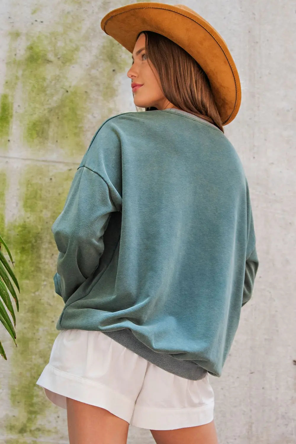 Product Detail: This snow washed pullover showcases a relaxed fit, ribbed trim at the neckline and cuffs, and a bold contrast horseshoe applique with raw edge detailing and metallic grommet accents for a playful Western inspired look.