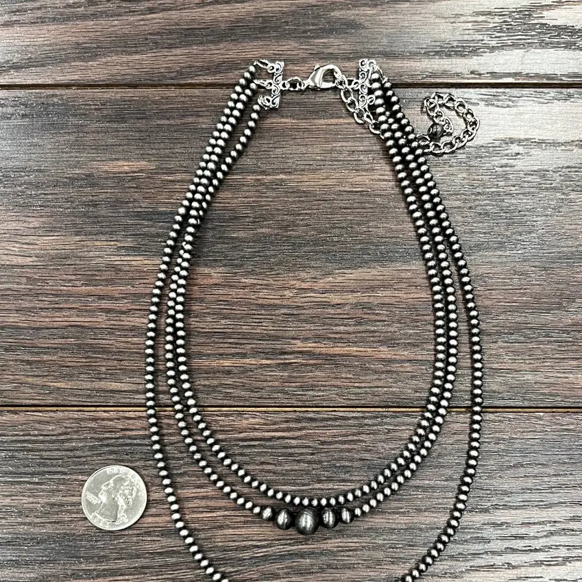 20" to 25" Long, Handmade 3-strand Navajo Bead Necklace * 3-strand (15", 16", 20" long) necklace & 5" extender * 15" long, 4mm navajo bead necklace * 16" long, 4mm, 6mm, 8mm, 10mm navajo bead necklace * 20" long, 4mm navajo bead necklace * 30 grams weight * Nickel, Lead & Chrome free
