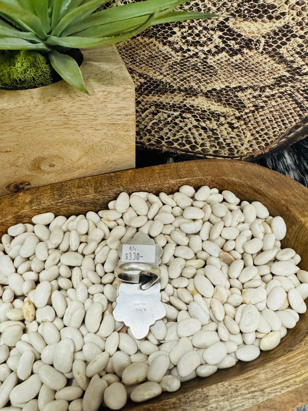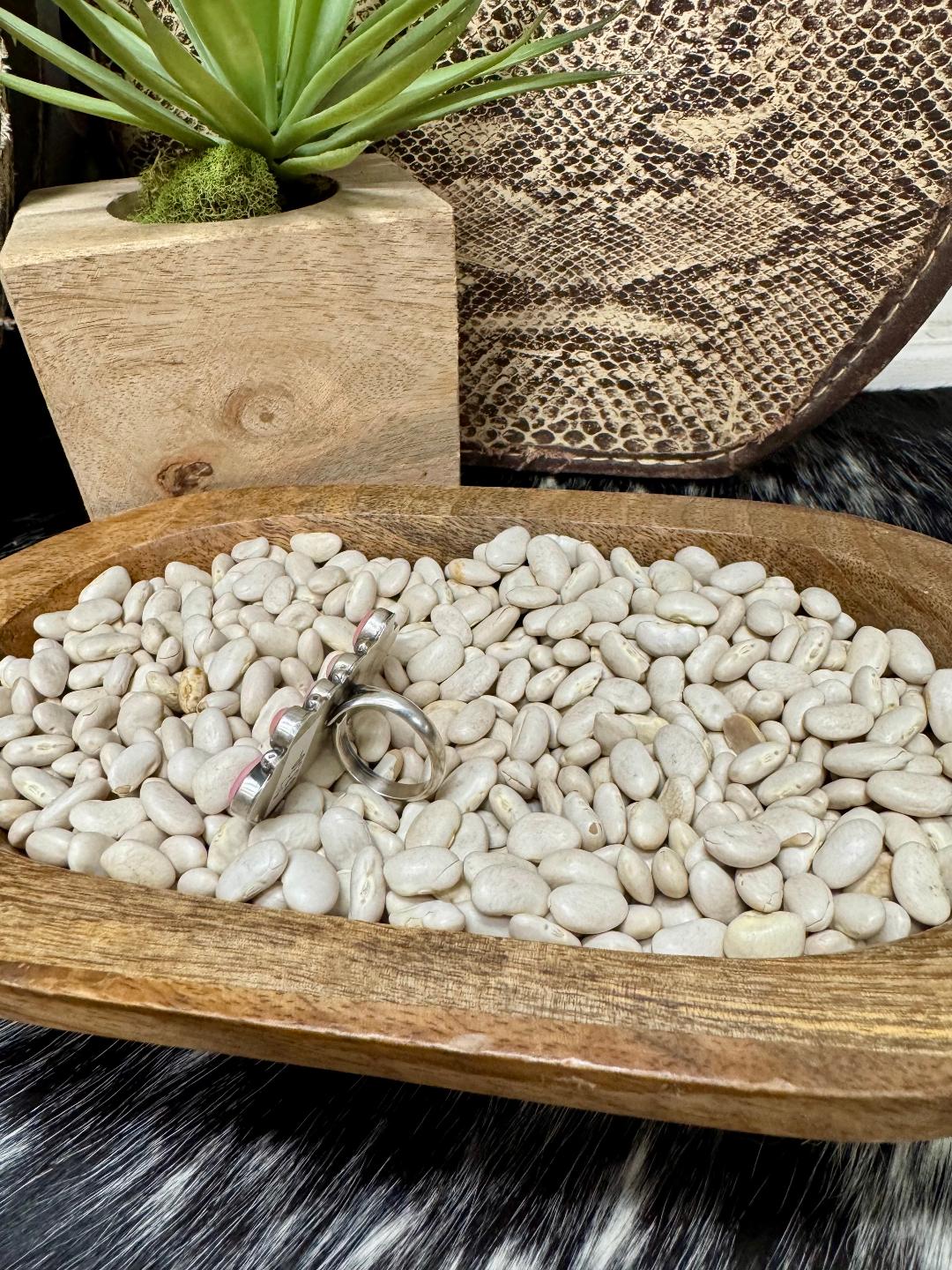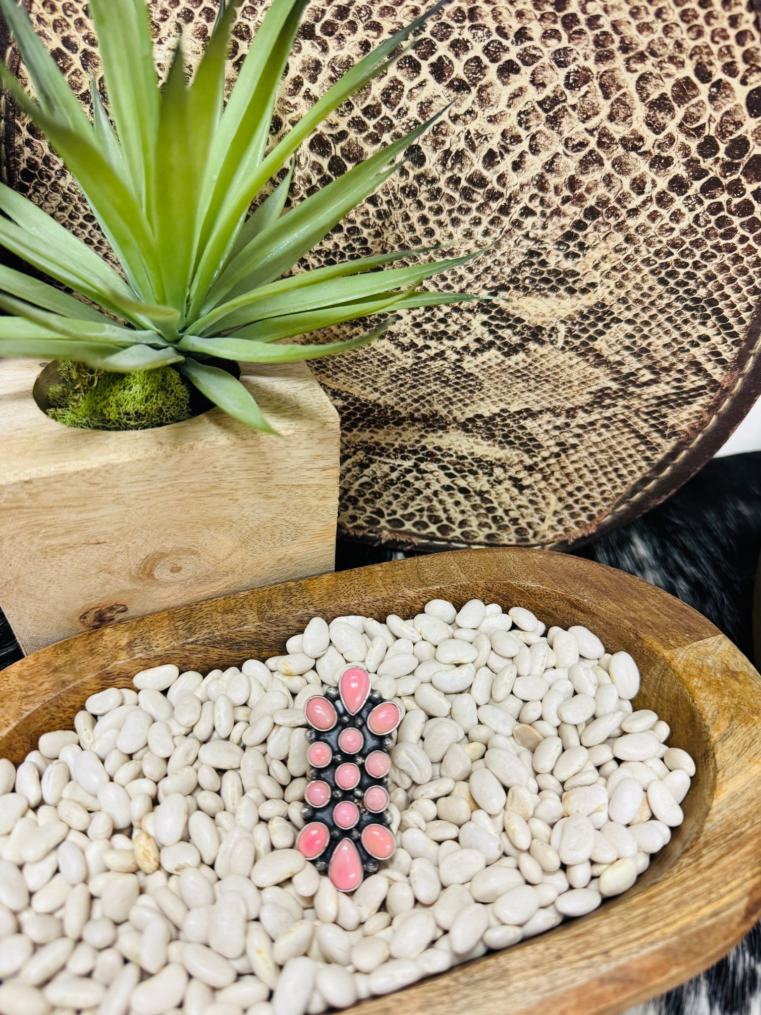 This authentic sterling silver ring features a stunning cluster of soft pink natural stones set in a bold, eye-catching design. The smooth cabochon stones create a beautiful contrast against the oxidized sterling silver, giving the ring a classic Southwestern look with a feminine twist.