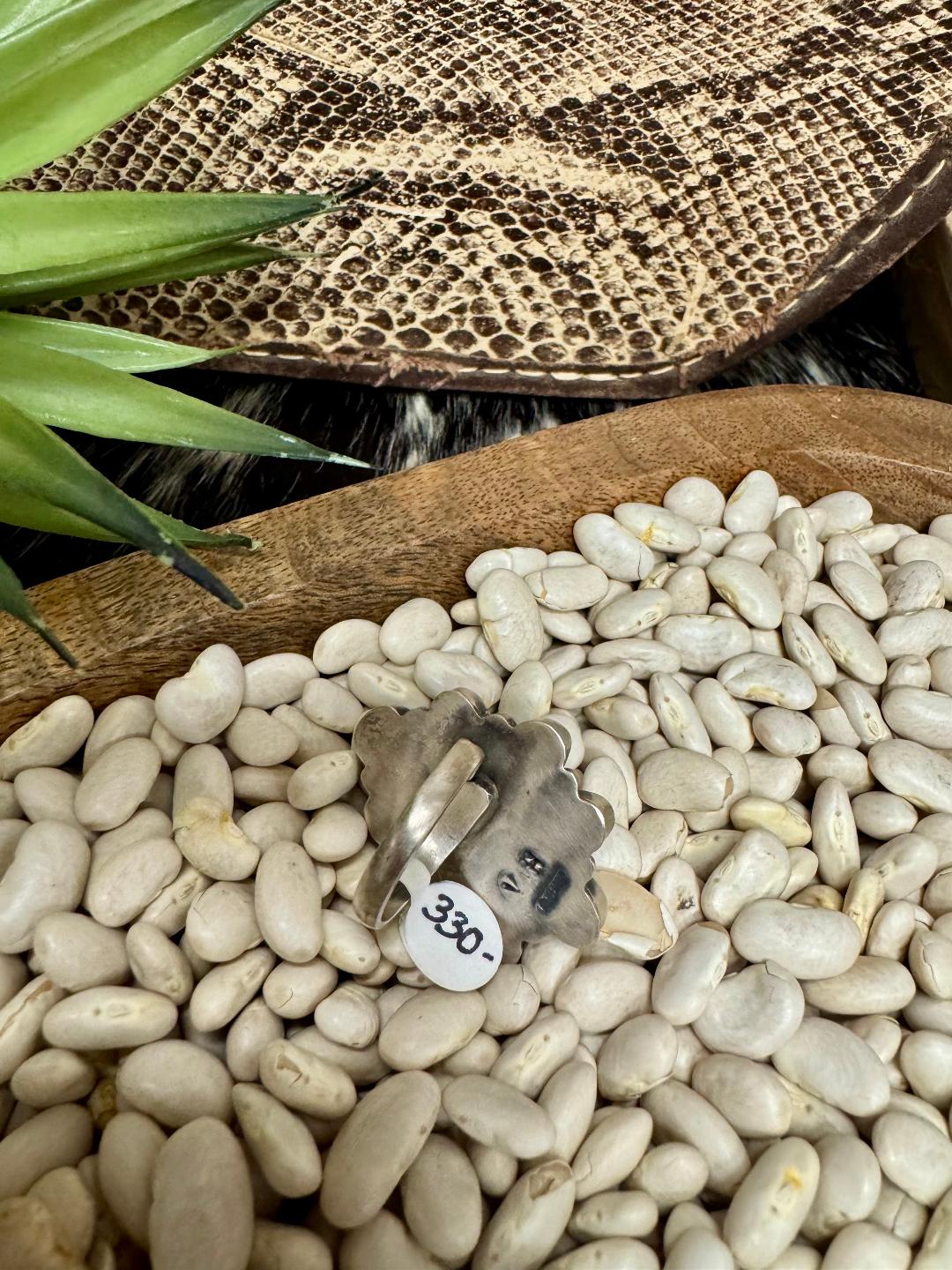 This authentic sterling silver ring features a bold cluster of genuine turquoise stones arranged in a striking Southwestern design. Each stone showcases vibrant blue tones with natural matrix details, giving the ring rich character and making it truly one of a kind. The oxidized sterling silver setting enhances the depth and highlights the handcrafted artistry.